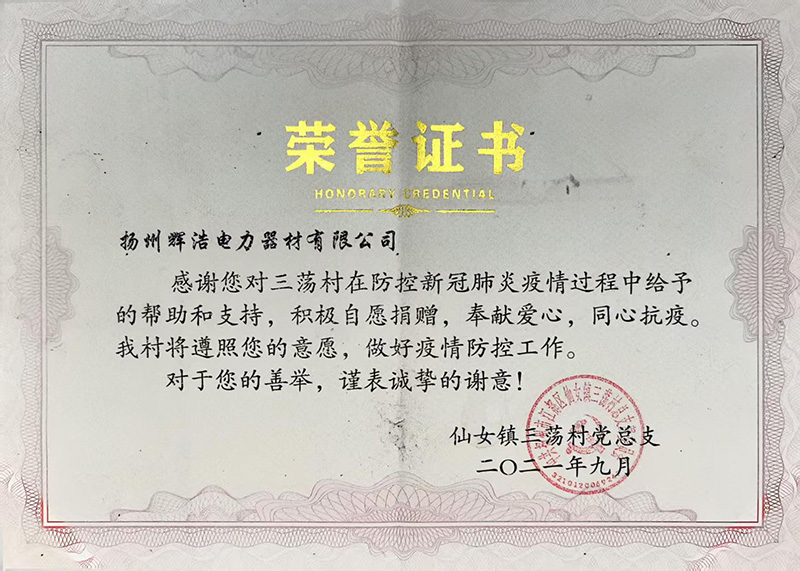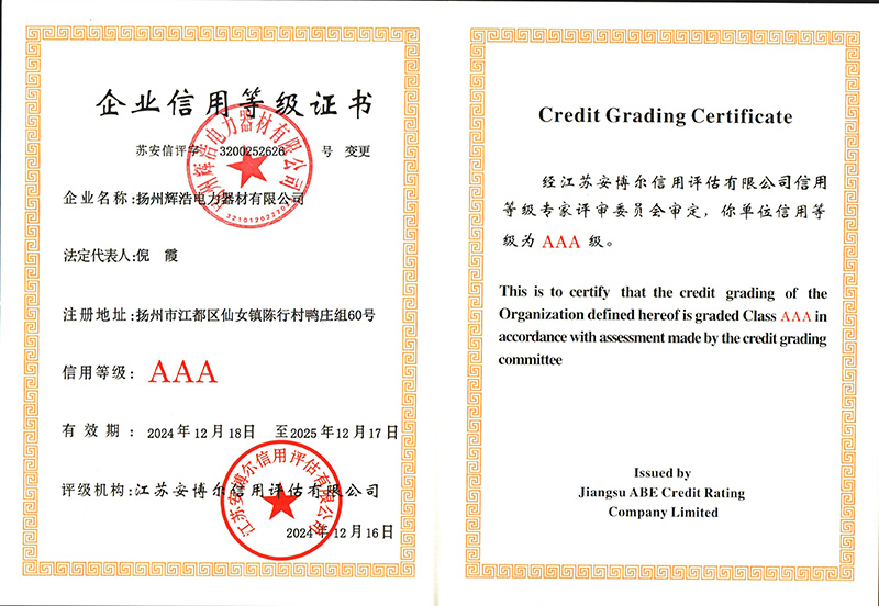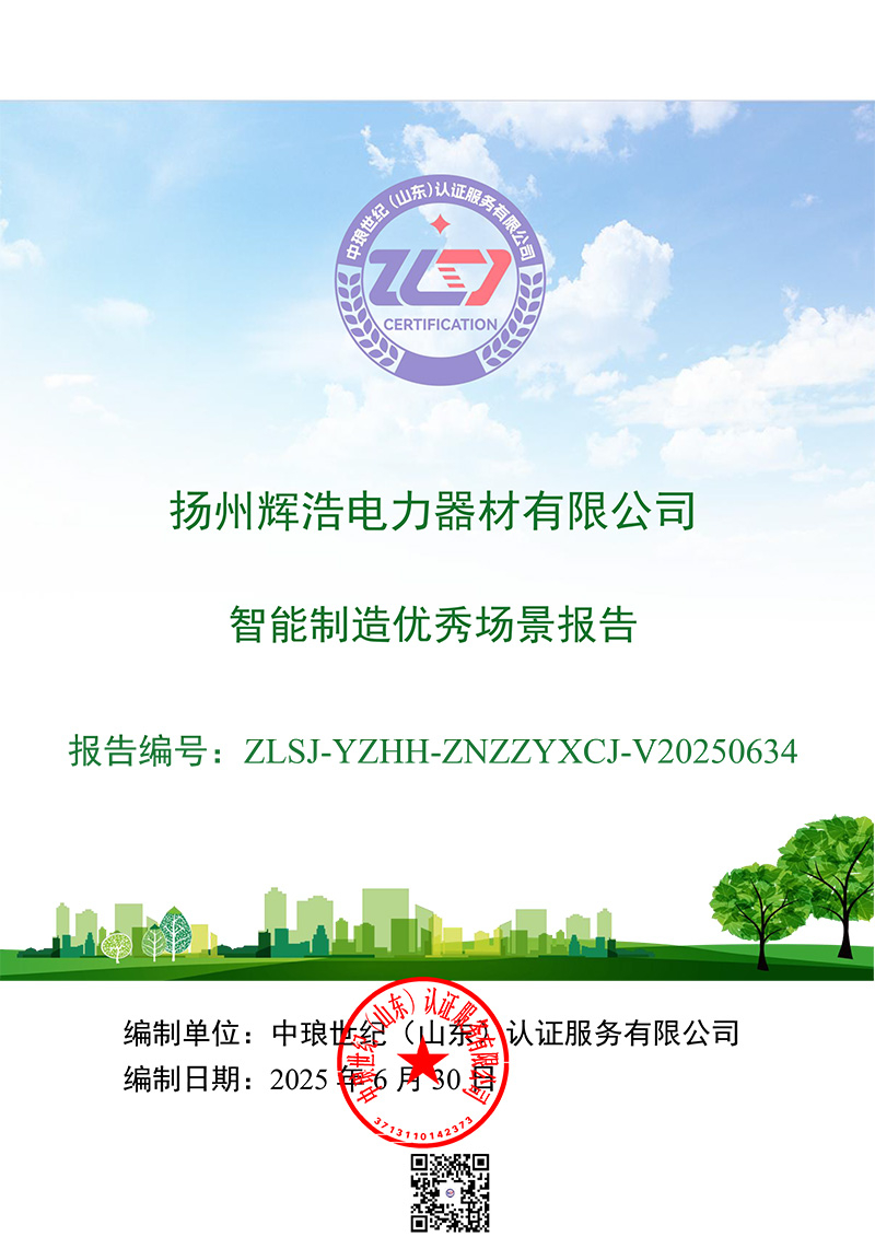 扬州辉浩电力器材有限公司(以下简称公司),座落在风景秀丽的古城扬州东大门-江都,在东西宁通高速公路、南北京沪高速公路的十字交叉路口,交通便利。公司成立于 2012 年 4月, 注册资本3000万元,占地面积1万多平方米,员工近百人,其中高级职称3人,中级职称10人。公司系国家高新技术企业、扬州市重合同守信用企业、“AAA”级信用等级企业。